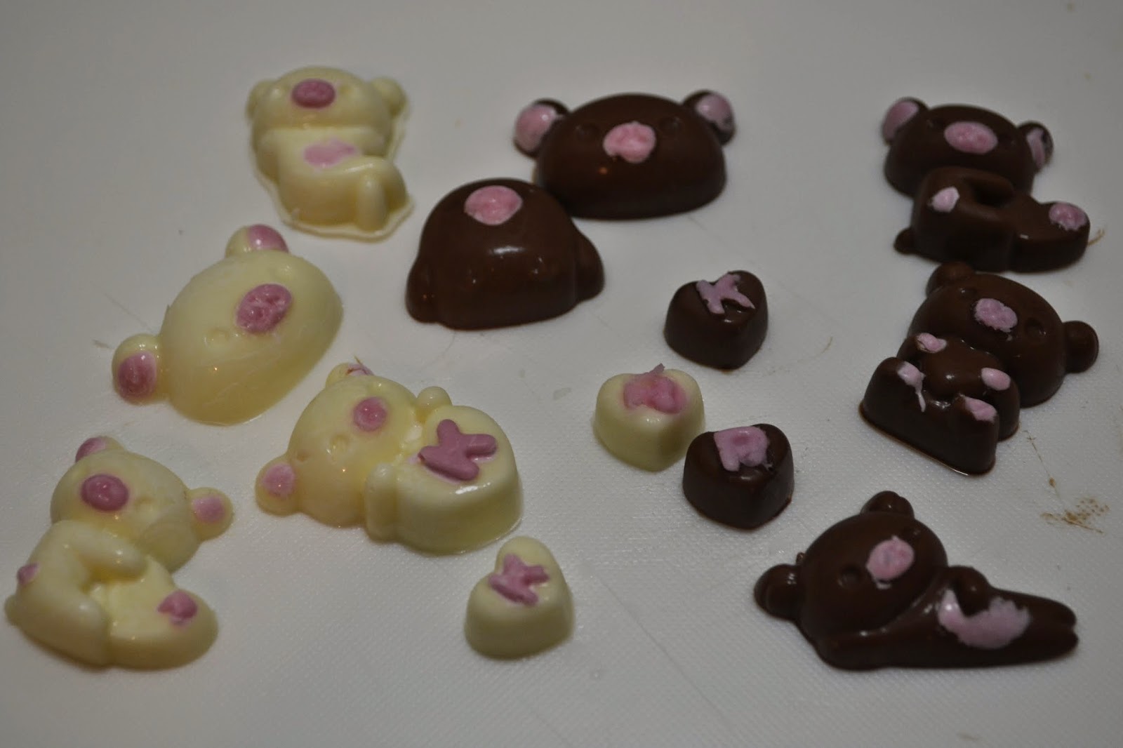 2. Fill in the molds. Start with the details (pink) then add in the rest (either white or milk chocolate)