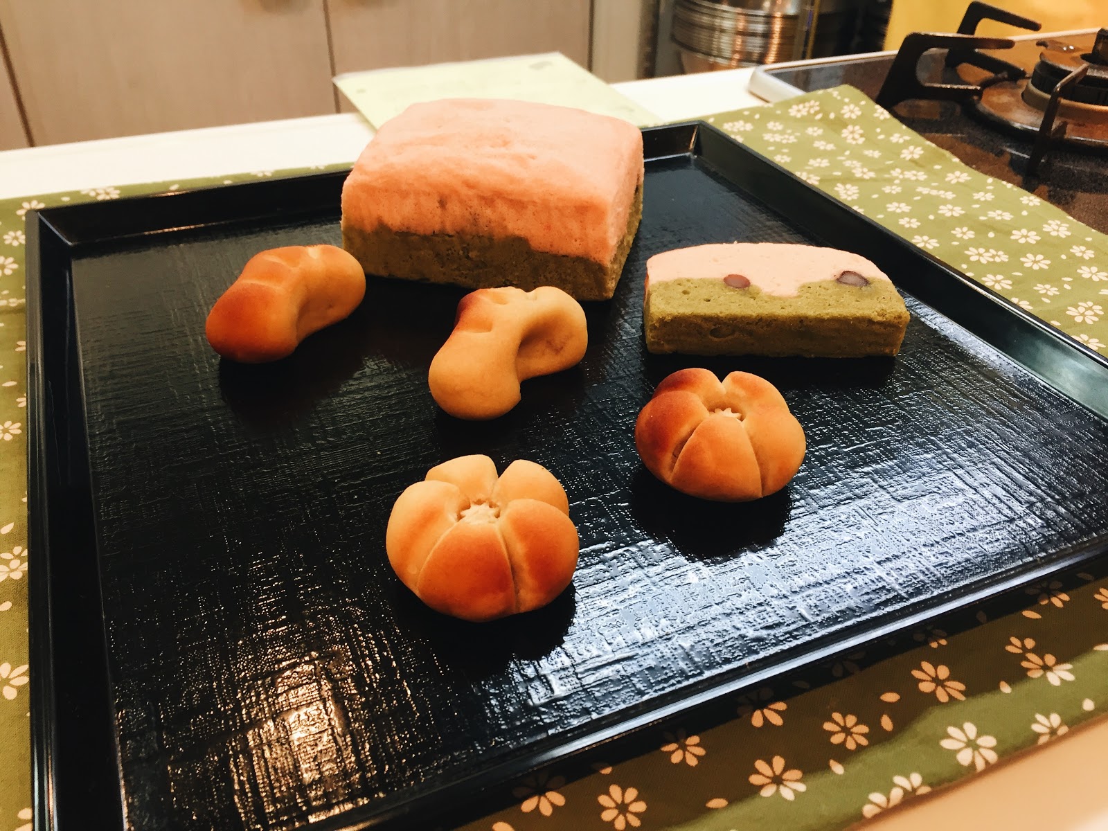 Yesterday, I learnt how to make 浮島 (ukishima – the cake like thing) and 桃山 (momoyama – the biscuits in front). The MVP of the day was shiroan (white bean paste) because we used it for everything.