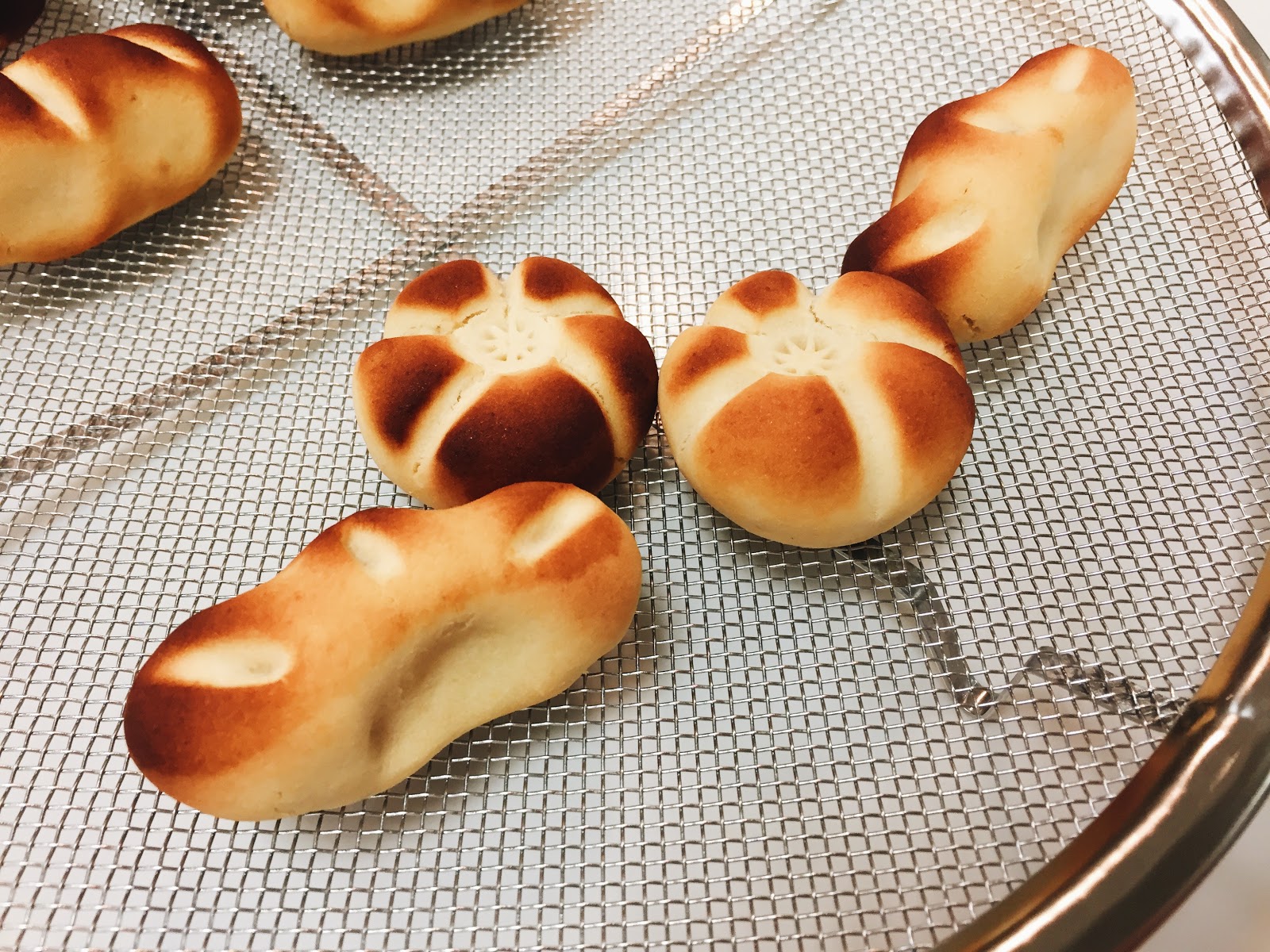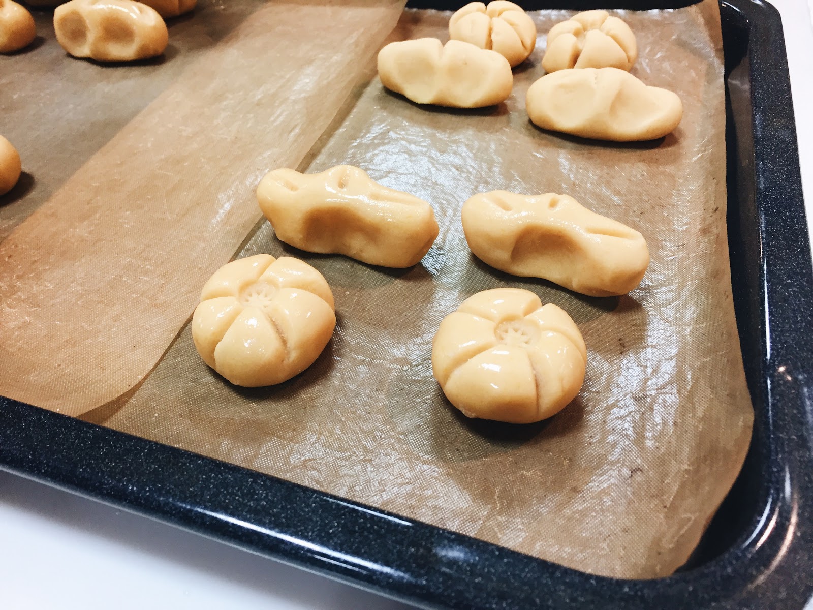 And these are the 桃山 before they go into the oven. I made them in the shape of 梅 (ume; plum) and 松 (matsu; pine). I think ume is cuter though. Believe it or not, but the outside “biscuit” is shiroan (plus boiled egg yolk plus raw egg yolk plus mirin plus oil) and the inside is yuzu + shiroan.