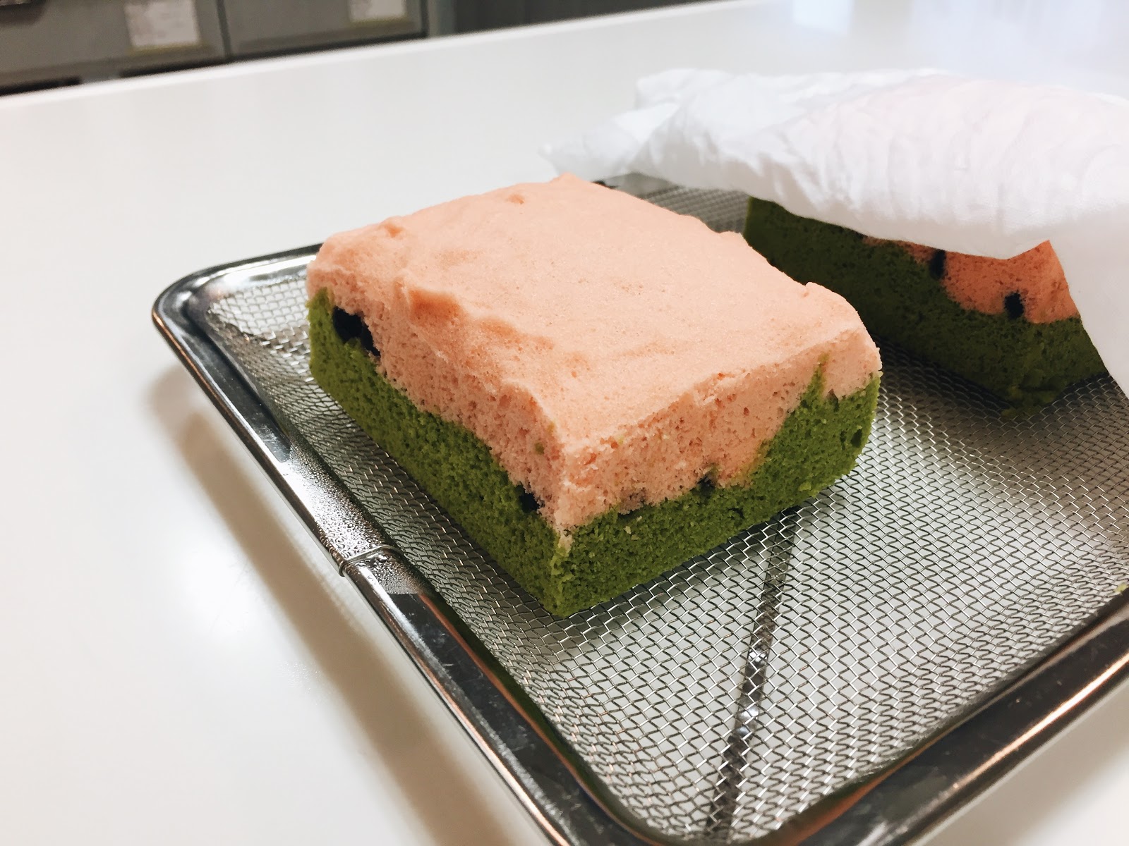 We’re not supposed to cut it until it’s cooled, which means we have to bring it home, but I had zemi that day and was late. Late in the sense that when I finished the wagashi class, my zemi had already started (for almost two hours). Sensei said that all would be well if I bring him what I make so the teachers helped me cool the cake down so I could cut his portion out.