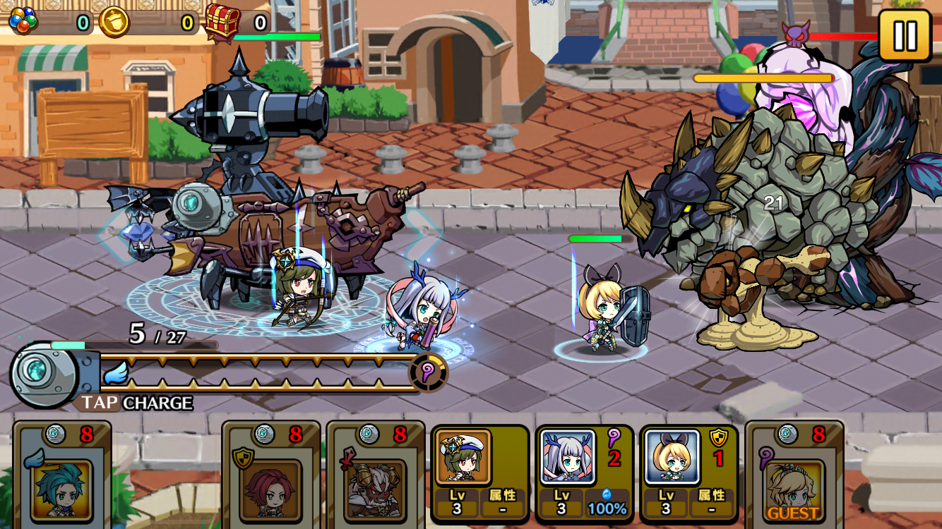 The actual battle is basically a lot of tapping. You tap/press and hold to charge the bar at the bottom (it’s at 5/27 in this screenshot) and when you have enough power, you can summon a character. Some characters have special skills, and you need a certain number of symbols (there’s one in the bar in the screenshot) to activate it. The game is won when you defeat the boss and the game is lost when your ship (the big brown thing) loses all its hp. You can upgrade your boat through various missions. You can upgrade your players if you can get the required items + coins.