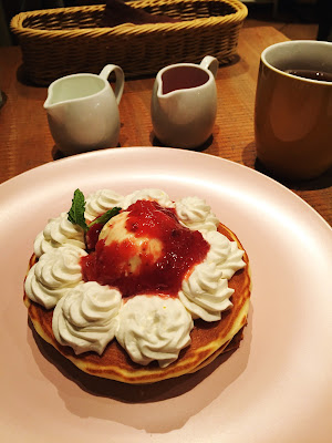 I ended up eating one pancake alone (since it was soaked with the milk + strawberry sauce), one with the cream and strawberry sauce on top, and one with ice-cream. So I got three different flavours (sort of different?) in one dish.