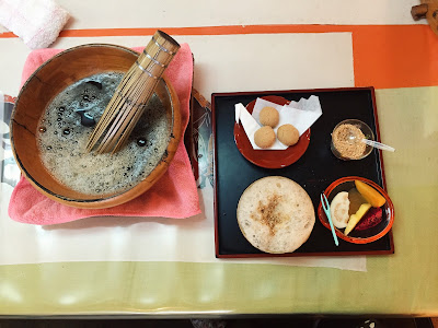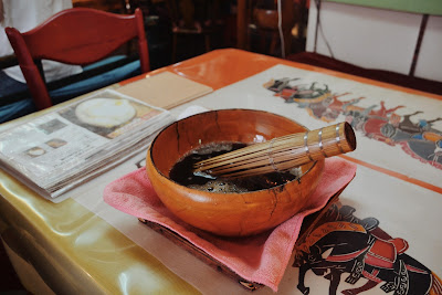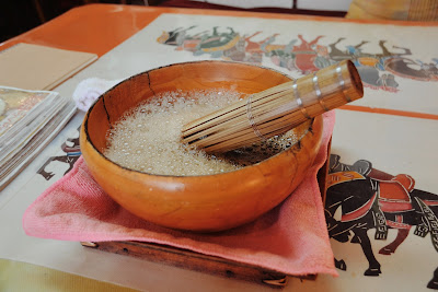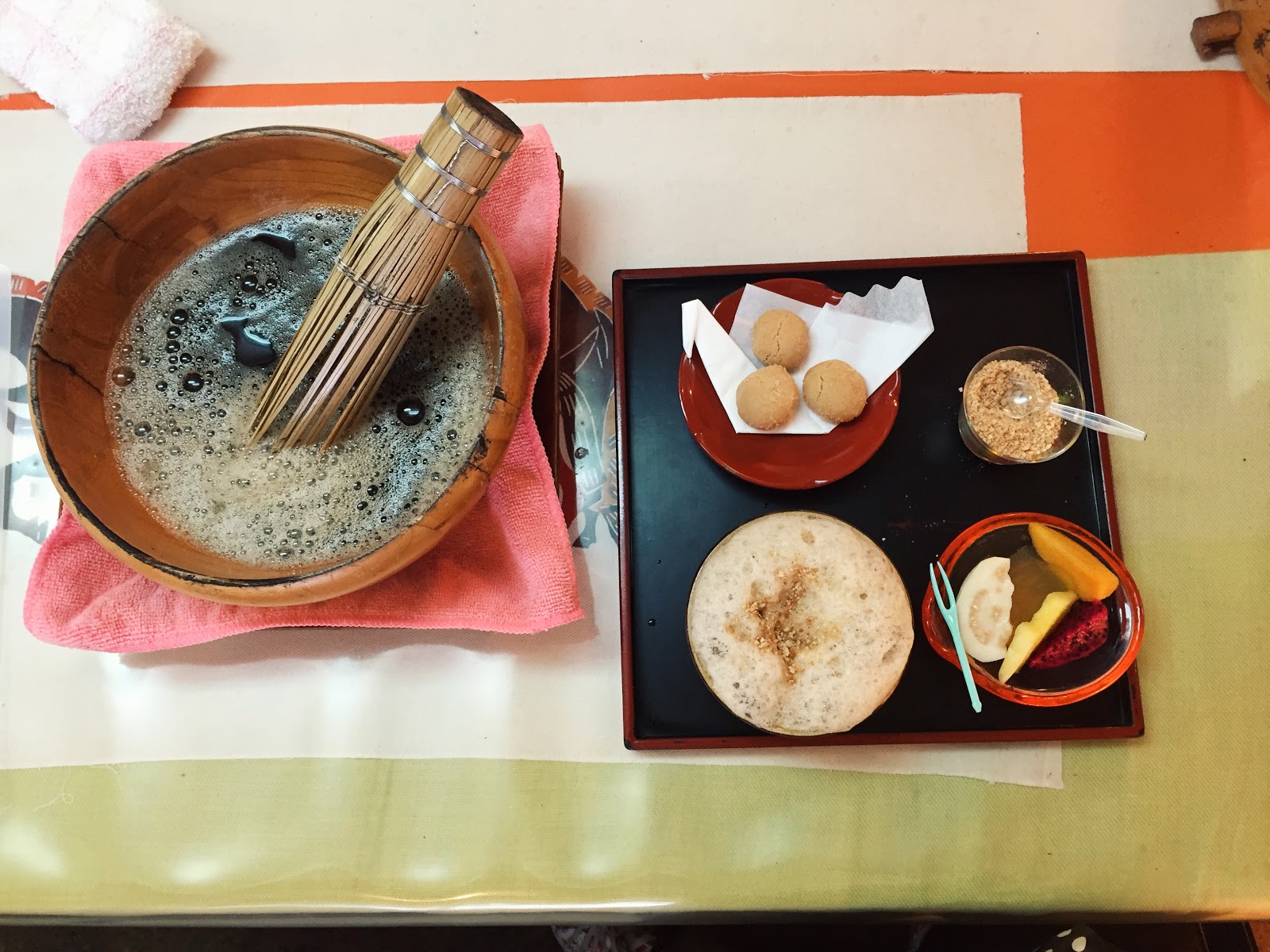 The tea smelled like mugicha and the I was told to do was to whisk the tea in the large wooden bowl to make bubbles. There’s no particular method, but you should be whisking the top layer of liquid and for about 2-3 minutes. Then you let the bubbles sit to firm up (I believe the words were along the lines of しっかりする) and then you can transfer them to the drinking cup.